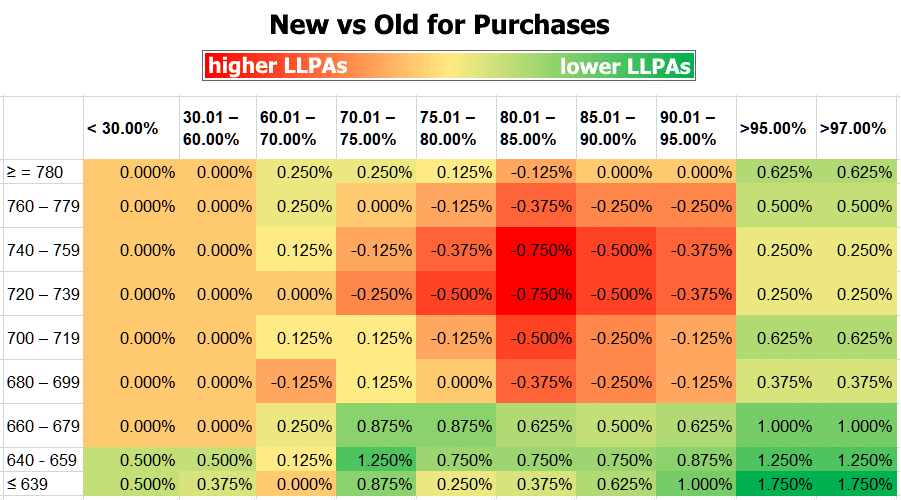 The change to LLPAs has caused a shift in costs between borrowers with different credit scores. While there is more of an improvement for lower credit score rows on purchases, the change amounts to a tweak of an existing fee structure in favor of those with lower credit scores and at the expense of those with higher credit scores. This means that those with lower credit scores will not pay less than those with higher credit scores, but the difference between the two is smaller than it was before. The change was implemented to promote affordable home ownership, which is part of Fannie and Freddie’s mission.